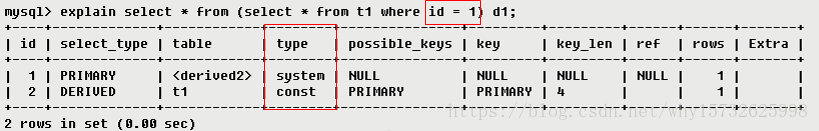 首先进行子查询得到一个结果的d1临时表,子查询条件为id = 1 是常量,所以type是const,id为1的相当于只查询一条记录,所以type为system。
