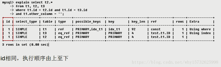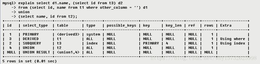 - 执行顺序2:id为3,是整个查询中第三个select的一部分。因查询包含在from中,所以为DERIVED【select id,name from t1 where other_column=’’】
