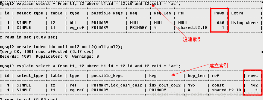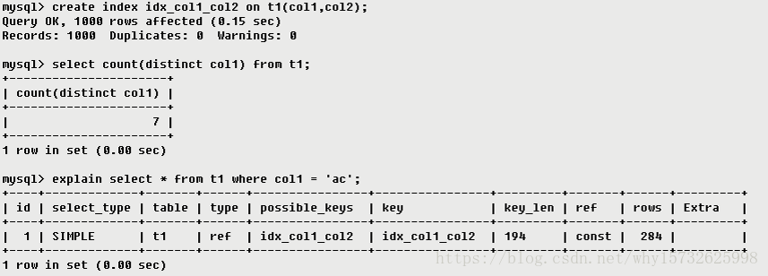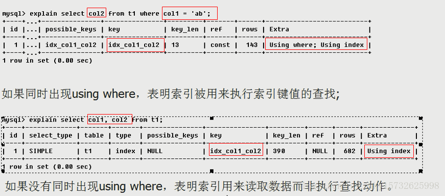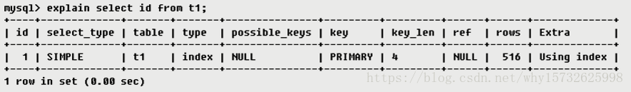 - 查询中若使用了覆盖索引(select 后要查询的字段刚好和创建的索引字段完全相同),则该索引仅出现在key列表中