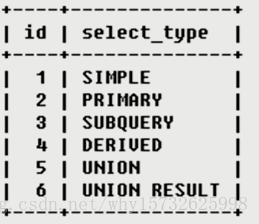 - UNION :若第二个SELECT出现在UNION之后,则被标记为UNION:若UNION包含在FROM子句的子查询中,外层SELECT将被标记为:DERIVED