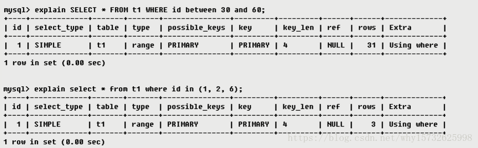 - range :只检索给定范围的行,使用一个索引来选择行,key列显示使用了哪个索引,一般就是在你的where语句中出现between、< 、>、in等的查询,这种范围扫描索引比全表扫描要好,因为它只需要开始于索引的某一点,而结束于另一点,不用扫描全部索引。